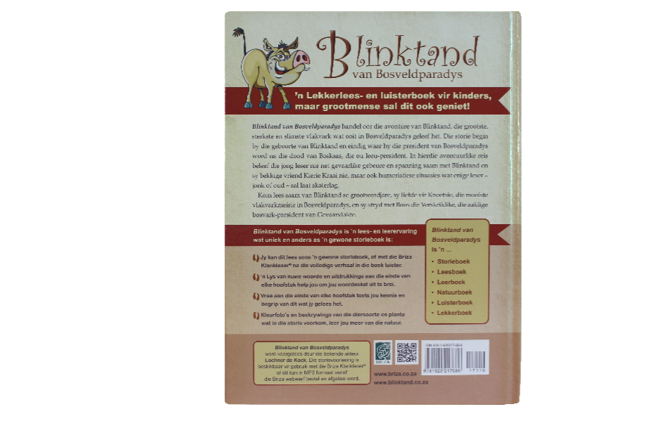 Blinktand van Bosveldparadys is ‘n unieke lees- en leerervaring: jy kan dit lees soos ’n gewone storieboek, of met die Briza Klankleser® na die volledige verhaal in die boek luister. ‘n Lekkerlees- en luisterboek vir kinders, maar grootmense sal dit ook geniet! Dit is ’n storieboek, leesboek, luisterboek, leerboek, natuurboek asook ‘n boek met sterk onderliggende opvoedkundige temas soos respek, eerlikheid, naasteliefde, nederigheid, leierskap, vasberadenheid, deursettingsvermoë, vergewensgesindheid en dankbaarheid.